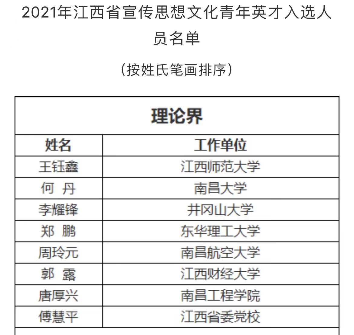近日,中共江西省委宣传部公布2021年江西省宣传思想文化英才入选人员名单,统计学院副院长郭露教授入选江西省宣传思想文化青年英才名单(理论界)。