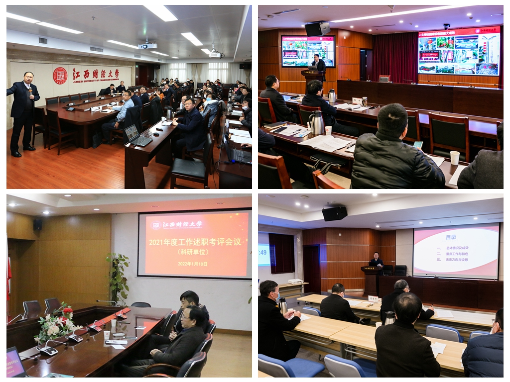 在科研单位考评会上,5个科研单位负责人用简洁高效的报告与PPT演示,围绕2021年重点工作完成情况、存在问题、2022年工作目标及主要思路,从党史学习教育、学术期刊发表、学科交流建设、人才队伍培养、服务地方发展等方面作了汇报,全方面、多角度反映了我校科研工作的水平,为建设高水平财经大学凝心聚力。