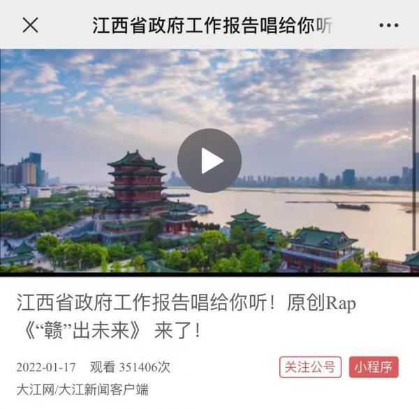 近日,江西省十三届人大六次会议胜利闭幕,在会场印制的政府工作报告首页右上角,一个广受好评的二维码以形式新颖、内容优质等特点吸引了大家的目光。通过扫码可以看到6个形式创新的融媒体作品,其中就包括学校党委宣传部与大江网合作的说唱歌曲《“赣”出未来》,歌曲由我校新媒体运营中心学生蔡昕毅作曲并演唱,目前视频在大江网播放量达35万次。这也是江西省首次尝试用Rap音乐形式,唱出江西政府工作报告。