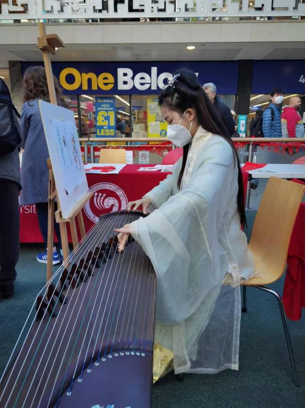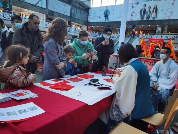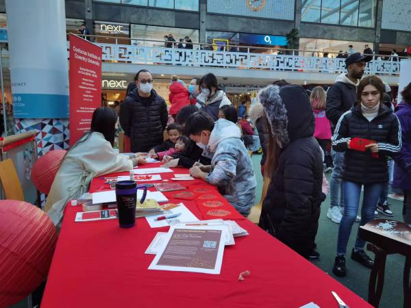 2022年1月29日腊月二十七日,受考文垂市Lower Precint商场的邀请,考文垂大学孔子学院在考文垂市中心最大的下沉广场举行“虎到、福到、新春到”虎年主题新春活动,书法、古筝、剪纸等富有浓郁中国特色的活动,近5个小时的中华文化沉浸式体验,热闹非凡。孔院教师弹奏的古筝民乐引起了大家对中国民族乐器的好奇心,纷纷驻足欣赏;书法桌前市民们一度排起长队,只为了领取孔院教师现场书写的福字和小春联;极具虎年元素的剪纸不仅吸引了小朋友的目光,很多年轻人也跃跃欲试,跟着孔院教师尝试亲手剪只可爱的小老虎带回家......挂上灯笼、贴上春联,摆上中国结,浓郁的年味儿在空气中弥漫开来。