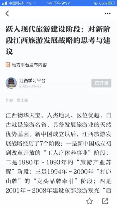 近日,学习强国江西学习平台全文转载了智库建设中心副主任曹国新副教授刊发于《江财智库专报》2022年第6期的研究报告《跃入现代旅游建设阶段:对新阶段江西旅游发展战略的思考与建议》一文。研究报告将新中国成立以来江西旅游省级发展战略梳理为7个阶段,提出这7个阶段各自完成了阶段性使命,但存在上下游产业链不全、持续赶超后劲不强、产业效率提升能力不强、国有旅游资源招商机制不全、景区委托管理乡镇模式不全、旅游数字经济转型能力不强等深层结构问题,提出了应聚焦构建“现代旅游业体系”,向文旅产业链链长制要集约、向新型农村集体旅游经济要用地、向特色旅游数字经济赛道要突破,全面跃入“现代旅游建设阶段”的政策建议。报告结合深度调研的成果,列出了全面跃入“现代旅游建设阶段”的若干主题工作。
