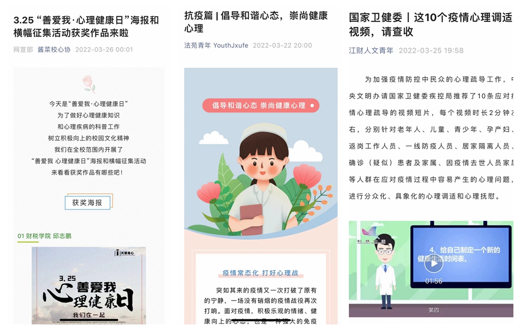 自从学校封闭式管理以来,心理健康与咨询中心主任唐海燕吃住在办公室,及时召开线上各学院心理辅导员例会,指导心理辅导员在学院开展“每天做一次心理健康手操”活动,通过公众号发表几十篇与疫情心理调适相关的文章,校园管控期间累计为40多名同学提供了帮助。法学院党委书记郭海峰吃住在学院办公室,时刻关注疫情动态发展,以身作则,坚守岗位,主动梳理学院学生特殊群体心理动态,敏锐发现因疫情原因加剧心理波动的个体,进行及时的心理辅导,安抚好学生情绪。人文学院疫情防控小组也非常关心学院学子的身心健康情况,开设了一系列的线上运动打卡、寝室歌王、寝室收纳大比拼等活动,微信公众号及时推送疫情期间心理调试、情绪管理相关视频推送,辅导员殷微微、江超颖为同学们提供职业规划、就业指导、心理疏导等全方位服务。