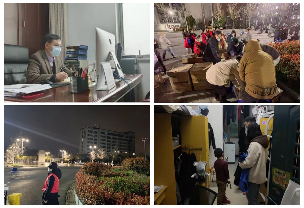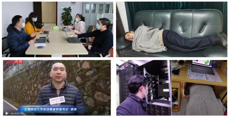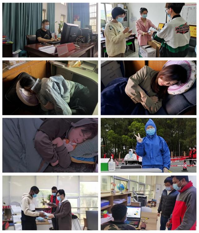“看到大家忙碌的身影,吃着校友捐赠的泡面和橙子,虽然很疲惫,但却感受到浓浓的爱和温暖。”为及时全面准确掌握全校各类人员核酸检测数据及相关信息,学校紧急抽调夏贤明、王炜、张欣艳、魏丽艳、赵金月、李世宇六位同志,成立了核酸检测数据统计工作专班。专班在各单位的积极配合下快速确定了全校“应管人员名单”,每一轮全员核酸检测后,专班同志都要对65个单位近4万人的上报数据进行逐一核查比对,发现的异常数据及时联系相关单位和个人核实修正,为学校疫情防控工作快速科学决策提供了重要的数据支撑。后勤与资产管理处从干部到群众都主动投身疫情防控工作中,党员干部坚持靠前指挥、一线调度,冲锋在前、迎难而上,忙前忙后、不畏辛劳,始终坚守岗位。办公室副主任黄广辉连续8天都工作到凌晨,累了就在办公室沙发上休息。保卫处根据疫情变化不断强化各校区大门卡口管理,承担了多轮、多点、高频核酸检测的安全保障和秩序维护,将“110”视频监控中心临时改为疫情防控指挥中心,处领导分区蹲点,靠前指挥,24小时全天候调度,同时成立了由5名年青骨干组成的应急支援小组,随时处置突发情况。校团委兼职副书记胡坤承担我校全员核酸检测学生志愿者统筹协调工作,为应对突发状况,他留宿办公室,连续7天坚守在检测现场协调工作,保持24小时在线状态,带领“红马甲”为我校疫情防控工作筑起一层“安全网”、一道“风景线”。校团委办公室钟贞保持随时待命状态,组织协调青年突击队和志愿服务预备队,随时响应物资搬运、秩序维护等保障工作,在第一轮核酸检测前创造了不到4分钟召集300余名志愿者的“江财速度”。为保障学校主干网络平稳运行,应对线上教学突发网络故障,智慧校园管理中心魏柏顺、李喜军、甘强和王刚四位同志连续多日吃住在学校,24小时全天候待命,扛起保障学校的网络畅通稳定的重要任务,实现了线上教学和资源、虚拟实验室的无缝衔接,保障了线上教学网络教学平台运行稳定。