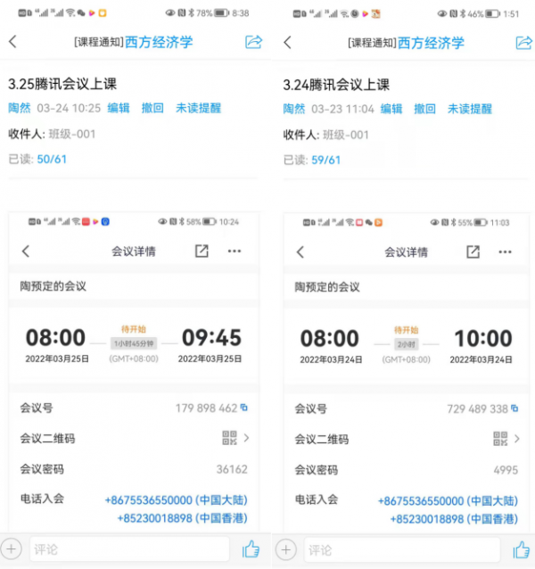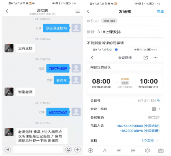 第一,通知不能到堂的学生线上学习的方式。线下教学时,由于个别学生因为疫情的原因不能到堂学习,所以需要在教室里利用腾讯会议让这部分学生线上听课,一方面在学习通单独通知这部分学生,同时也在班级群中发布相关通知。