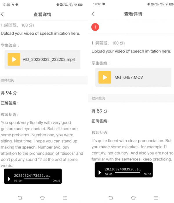 由于课堂时间有限,无法观看所有学生演讲视频,因此其他学生的演讲视频均提交到作业区。课后,我会认真观看每个学生的视频,并且给每个演讲指出优缺点及改进的方法,尽量让网课变得更有温度。
