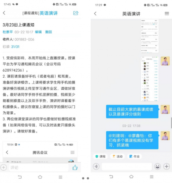 从3月中旬起本人就密切关注南昌疫情,预感线上授课不可避免。因此我及时开始规划网上课程安排,基于2020年的网上授课经验,我决定采用学习通加腾讯会议直播的方式。本学期我教授的《英语演讲》原计划采用线上线下混合式教学,学生课前预习学习通里SPOC课程内容,线下课堂检查SPOC学习及开展演讲模仿和自选题演讲课堂活动。面对本次突发疫情,我主要采取了以下方法: