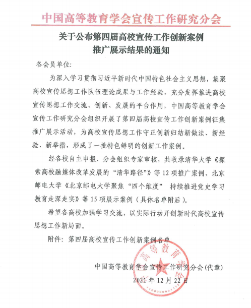 近日,中国高等教育学会宣传研究工作分会公布了第四届全国高校宣传工作创新案例,我校推荐的《三维度推动党史学习教育暖人心》案例成功入选。