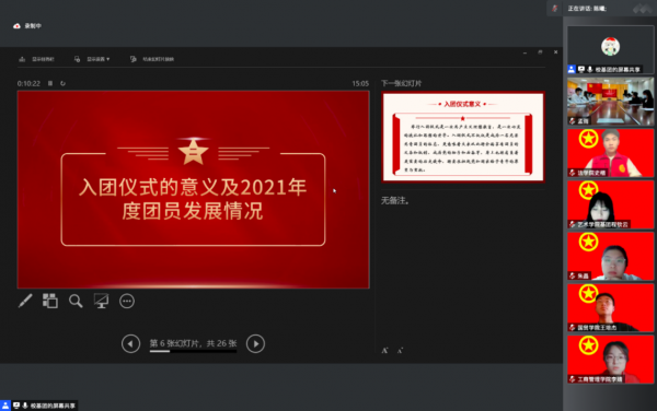 新发展团员入团仪式在嘹亮的团歌声中落下帷幕。此次线上入团仪式主题鲜明、形式新颖,进一步强化了团员意识,引领广大团员青年以青春之我担青春之责,用实际行动为团旗增光添彩。(文/校团委 陈可愉 阙湘橙 图/校团委 赵骏 编辑/舒佳珠 审核/姜莹 赵旻 李大晖)