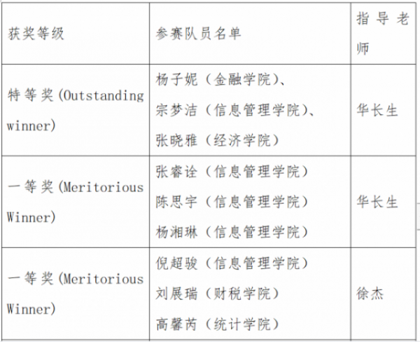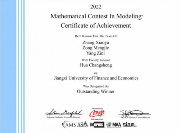 近日,2022年美国大学生数学建模竞赛(MCM)成绩揭晓,由我校金融学院杨子妮、信息管理学院宗梦洁、经济学院张晓雅三位同学组成的参赛队(指导老师:华长生)获得特等奖(Outstandingwinner),是江西省高校在该赛事中的第一个特等奖。据悉,全球共有15105支参赛队4万5千余人参加本届大赛,评选出23项特等奖,获奖率0.152%。