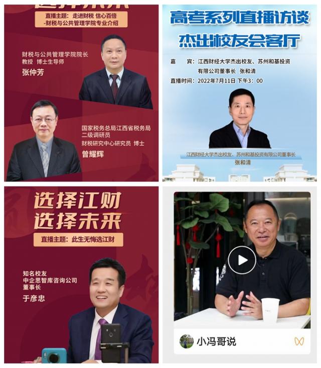 北京校友会执行会长于彦忠、苏州校友会名誉会长张和清、上海校友张文熙以及上饶校友曾耀辉、南昌校友徐凡等知名校友通过江财视频号、新浪网、大江网、中国交通电台等各大媒体宣传江财招生信息,南昌校友会名誉会长冯震利用抖音开展6期直播,宣传形式活泼、贴近生活、语言风趣幽默,圈粉无数,为提高江财的社会声誉发挥了积极作用。