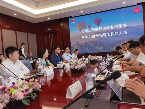招生就业处处长柳晨、国际学院党委书记邢小明、会计学院院长周冬华、软件与物联网工程学院院长白耀辉、大学生职业发展中心资深专家朱海琴以及华为财经招聘调配部部长周正、ICT产品与解决方案财经HRBP部长刘克书及所属校招团队、江财优秀毕业生代表共同参加了会谈活动。