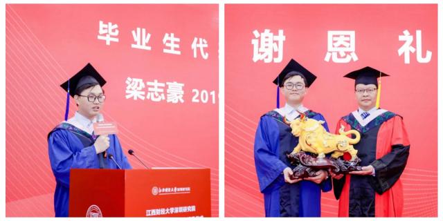 深圳研究院2019级毕业生代表梁志豪发表毕业感言,他对学校的栽培表达感恩,对曾经在学业中帮助自己的老师们表示衷心的感谢。在谢恩礼上,他代表2022年深圳研究院全体毕业生向恩师代表深圳研究院吴良平院长赠送谢礼。(图文/深圳研究院  编辑/董可心  审核/姜莹  赵旻  李大晖)
