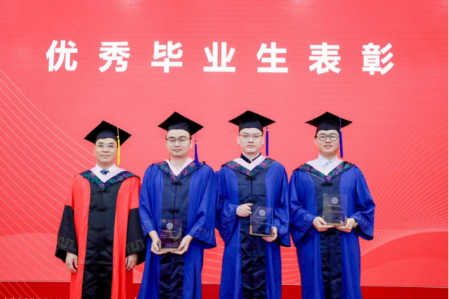 袁红林为毕业生拨穗并授予毕业证和学位证,各位毕业生在台下排成纵队,依次上台完成学位授予仪式。罗世华为梁志豪、万雪成、邹时杰位3位2022年优秀毕业生颁发荣誉证书。胡海波、周冬华为2022年毕业生颁发校友卡。
