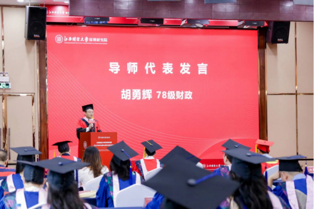 深圳研究院客座教授、1978级财政学专业校友胡勇辉代表导师发言,他祝贺毕业生们,并嘱咐大家在今后的工作中与生活中要不断地学习,增长与丰富自己的知识,全面提高自我认知能力。