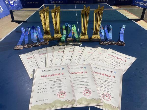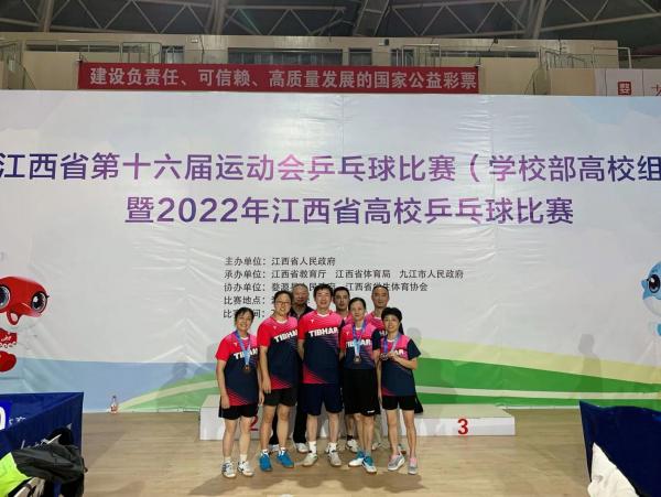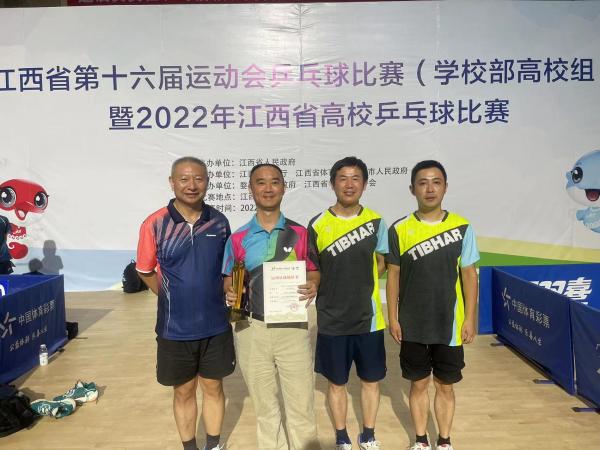 9月1日至6日,由江西省人民政府主办,江西省教育厅、江西省体育局、九江市人民政府承办,婺源县人民政府、江西省学生体育协会协办的江西省第十六届运动会乒乓球比赛(学校部高校组)暨2022年江西省高校乒乓球比赛在婺源县体育中心举行。我校乒乓球代表队在领队郑赟、詹新寰,教练员赵建强、耿啸虓的带领下,率男子、女子教工组,男子、女子学生甲组4支队伍参加了比赛,最终取得2银4铜前八名的优异成绩。