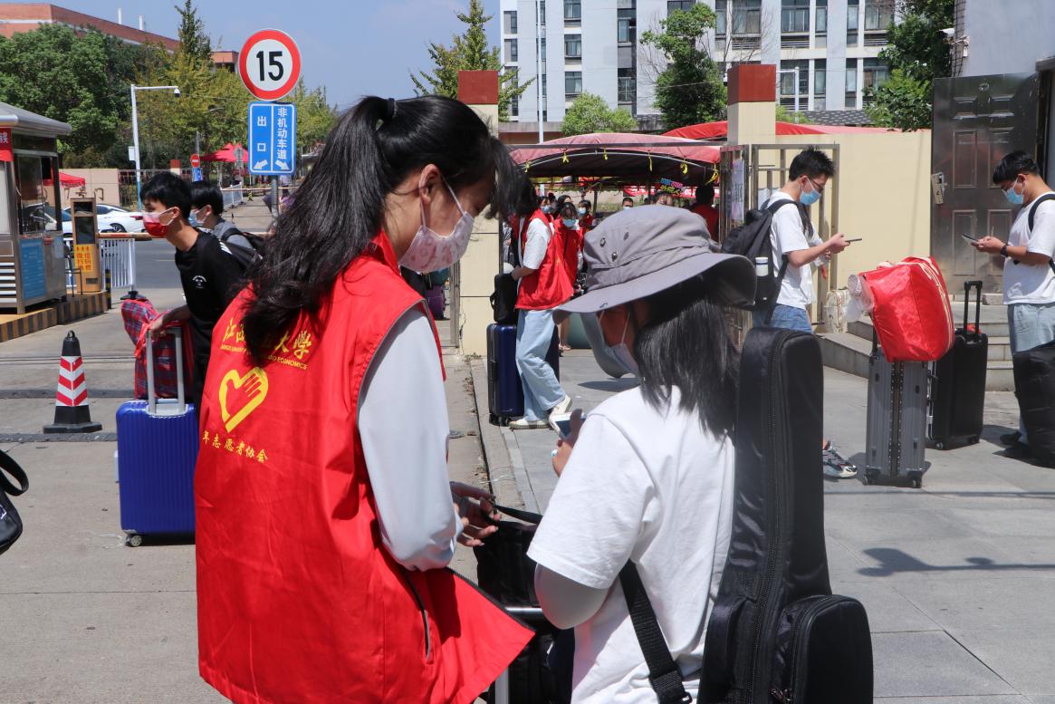 外国语学院的志愿者还在校区门口等候,迎接新同学,帮助新同学接行李,通过迎新工作专车接送新生到宿舍进行登记报道。