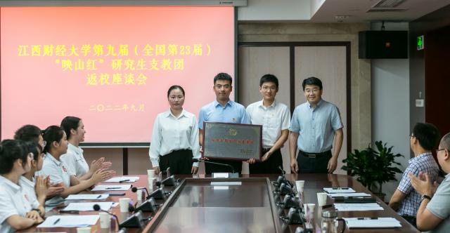 今年五月,在中国共产主义青年团成立100周年之际,第九届“映山红”研究生支教团从全省脱颖而出,喜获第25届江西青年五四奖章集体,取得我校在该奖项上的历史突破。邓辉代表学校致以热烈祝贺,并向研支团颁发奖牌。