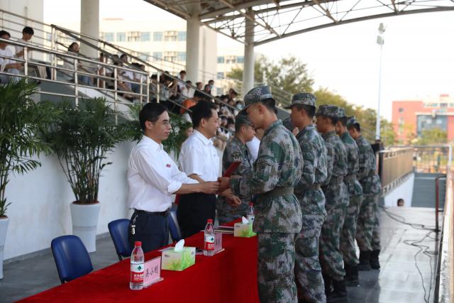 院党委副书记邱晓平宣读了军训表彰决定,对表现优异的教官及个人授予荣誉称号,鼓励广大新生向受表彰的同学学习,争做具有“信敏廉毅”素质的优秀学生。与会领导为他们颁发荣誉证书。
