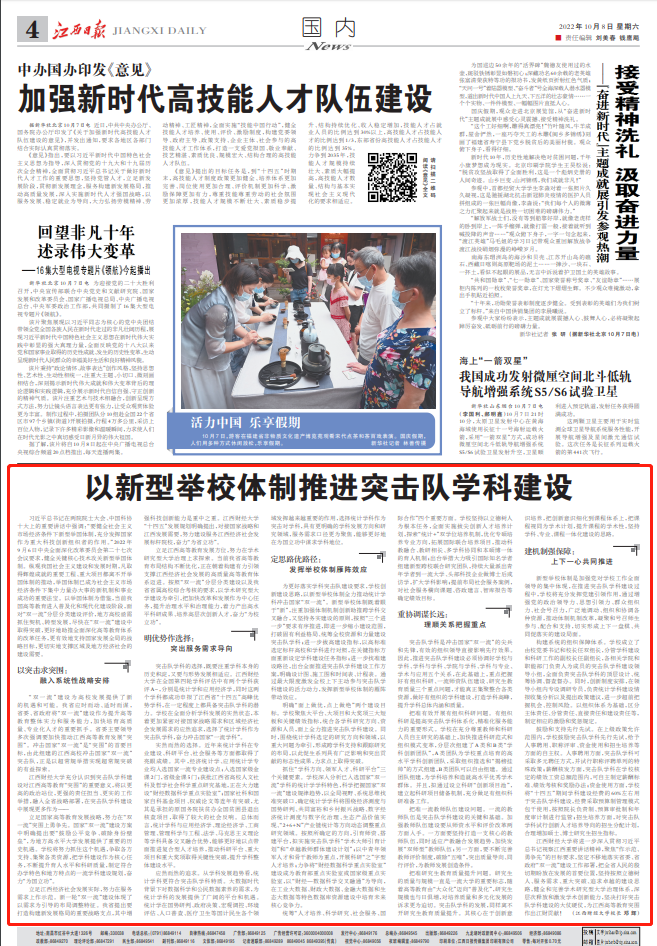 10月8日,《江西日报》04版以“以新型举校体制推进突击队学科建设”为题报道我校聚焦“作示范、勇争先”的目标要求,坚定不移地落实省委、省政府“双一流”建设工作部署,健全和完善学术研究型大学治理体系,深层次释放和激发学术创新能力,坚决打好突击队学科建设的大仗硬仗。