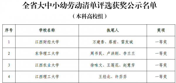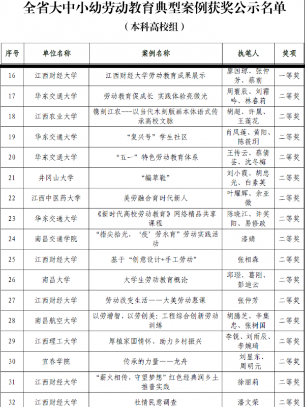 近日,省教育厅体卫艺处公示了全省大中小幼劳动教育典型案例和劳动清单征集评选结果,我校取得佳绩。《江西财经大学劳动教育成果展示》荣获全省劳动教育典型案例(本科高校组)一等奖,《基于“创意设计+手工劳动”》《劳动改变生活——大美劳动慕课》《“薪火相传,守望梦想”红色经典润乡土推普实践》《社情民意调查》等四个案例荣获二等奖,《江西财经大学劳动清单》荣获全省劳动清单(本科高校组)征集评选一等奖。