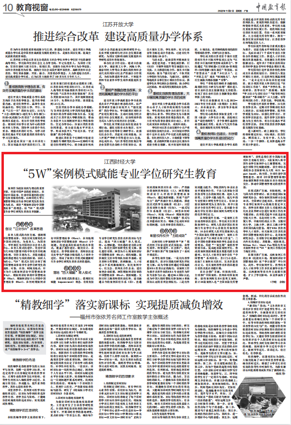11月2日,中国教育报10版“教育视窗”刊发题为“江西财经大学——“5W”案例模式赋能专业学位研究生教育”文章,报道我校工商管理学院以案例工作推动专业学位研究生教育改革,取得良好效果。人民融媒体平台(《人民日报》主办新媒体平台)同时转发该文章。