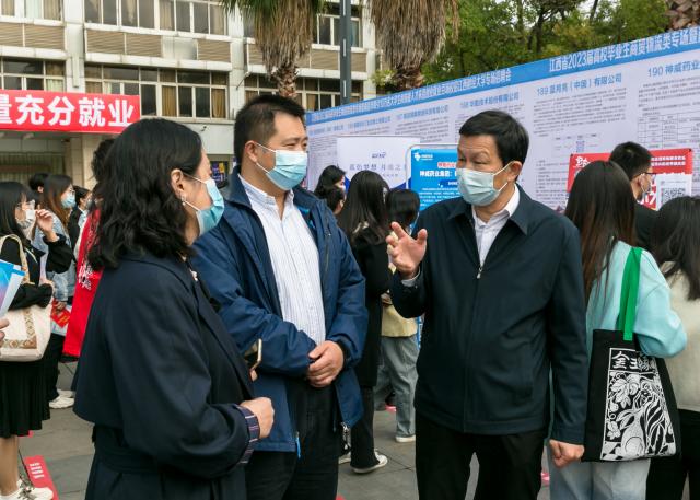副校长欧阳康查看现场情况并与用人单位和毕业生亲切交流,并现场指导就业工作开展。南昌市就业创业服务中心主任魏巍来到现场观摩活动,招生就业处处长柳晨、大学生职业发展促进中心主任黄雨虹、招生就业处副处长曾祥麒随同介绍情况。