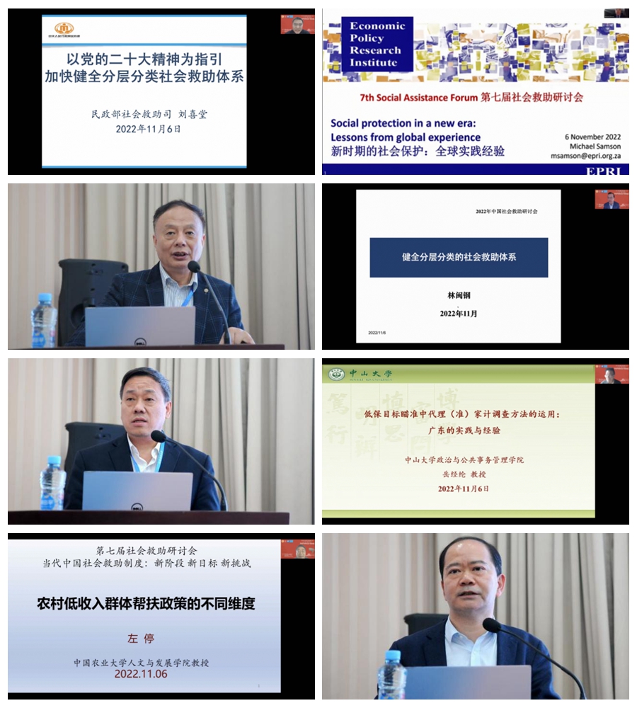开幕式后,进入主旨演讲环节,由中国社会保障学会理事、财税与公共管理学院院长张仲芳主持。民政部社会救助司司长刘喜堂,儿基会专家、经济政策研究所(南非)研究主任Michael Samson博士,中国社会保障学会副会长、南开大学关信平教授,中国社会保障学会副会长、南京大学林闽钢教授,中国社会保障学会社会救助分会副会长、中国人民大学杨立雄教授,中国社会保障学会社会救助分会副会长、中山大学岳经纶教授,中国社会保障学会社会救助分会副会长、中国农业大学左停教授,中国社会保障学会常务理事李春根教授八位专家先后以党的“以二十大精神为指引,加快健全分层分类的社会救助体系”“新时期的社会保护:全球实践经验”“我国社会救助制度的标准制定和瞄准机制改革”“健全分层分类的社会救助体系”“最低生活保障何去何从?”“低保目标瞄准中代理家计调查方法的运用:广东的实践”“农村低收入群体帮扶政策的不同维度”“社会救助研究的知识图谱、理论热点与合作网络”为题发表主旨演讲。