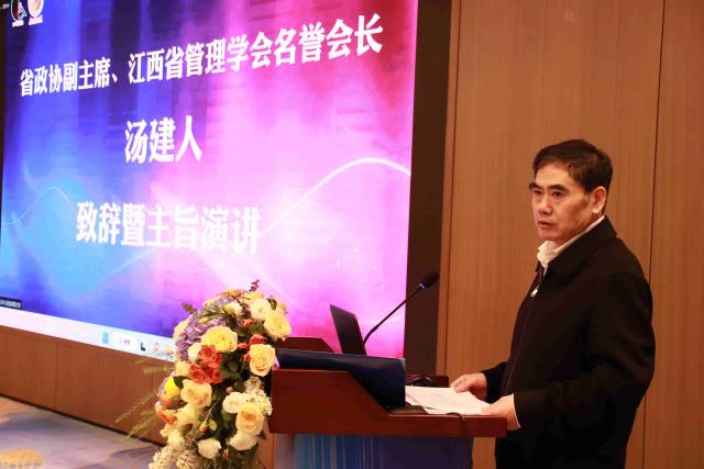 江西省政协副主席汤建人,江西理工大学党委副书记、校长温和瑞教授,江西财经大学原副校长、江西省管理学会会长吴照云教授,民进江西省委会一级巡视员陈洪萍,民进省委会专职副主委、萍乡市政协副主席崔传鹏,赣州市政协副主席蓝文,赣州市政协原副主席孔刃非,经济管理出版社社长杨世伟教授等领导和嘉宾出席会议,省内近20所高校的经管学院、商学院院长、副院长、系主任、骨干教师以及企业界代表共100余人参加会议。