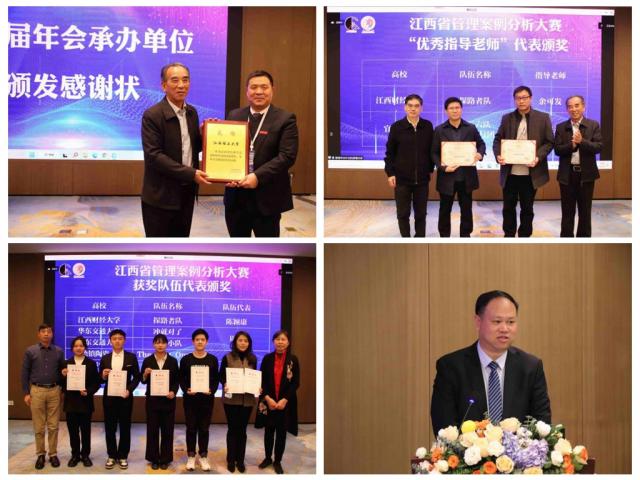 江西财经大学工商管理学院院长、江西省管理学会秘书长胡海波教授主持了江西省管理案例分析大赛颁奖仪式,表彰了获奖的本科生代表、研究生代表与指导教师代表。今年,来自全省各高校的509支队伍、3000余人参加了由江西省管理学会主办的江西省第二届大学生管理案例分析大赛,最终8所院校的10支队伍进入全省总决赛;66支队伍、约400人参加了由江西省学位与研究生教育学会、江西省管理学会联合主办的江西省首届研究生管理案例分析大赛,最终6所院校的10支队伍进入全省总决赛。颁奖仪式上,学会还向年会承办单位江西理工大学经济管理学院颁发了感谢状。