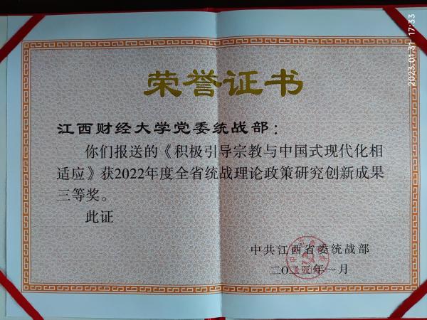会议通报了全省2022年度统战理论创新、实践创新、宣传信息工作等情况。我校党委统战部再次获评“全省统战宣传信息工作先进单位”,报送的统战工作实践项目《构建“四心”“四同”工作机制推进新时代高校统战工作高质量发展》获评全省统战工作实践创新成果奖,推荐的由马克思主义学院副院长李德满博士撰写的统战课题研究文章《积极引导宗教与中国式现代化相适应》获评全省统战理论政策研究创新成果三等奖。