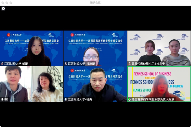 同日下午,我校还同法国雷恩高等商学院进行线上洽谈。雷恩商学院亚洲部负责人乔淑、孙利、杨蓓、雷恩中国代表处周小丁、杜贝宁以及我校国际文化交流中心主任杨勇和其他相关工作人员参加会议,会议由杨勇主持。