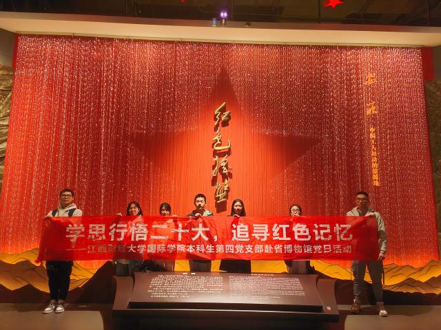 为深入贯彻学习二十大精神,感悟党史点滴、赓续红色血脉、激发爱国之情。4月23日,国际学院学生第四党支部赴江西省博物馆开展“学思行悟二十大,追寻红色记忆”主题党日活动,国际学院学生第四党支部党员、入党积极分子代表共同参与了活动。