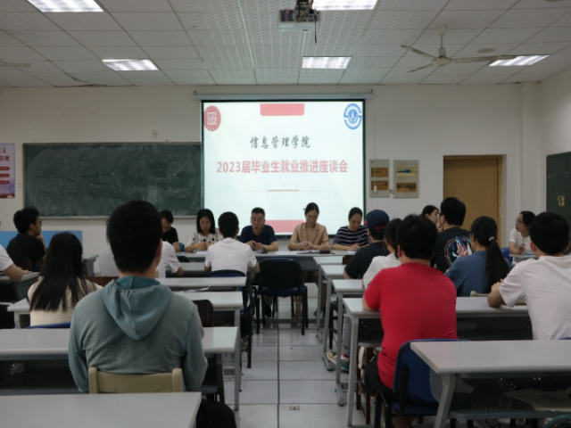 6月7日,信息管理学院开展2023届毕业生就业推进座谈会。学院党委书记张志军、党委副书记杨婉琪、学工办主任邹俊、团委副书记郭兆羚、辅导员刘燕婷、唐盛及各毕业班班主任参与此次会议。