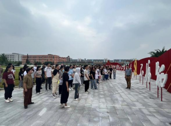 同学们边参观边了解广场上的红色建筑。红色文化广场以“伟大建党精神”为主题,由党徽、伟大建党精神32个大字和2021根红色柱阵组成,每个雕塑字高1.921米,2021根红色立柱寓意从1921年到2021年,象征中国共产党百年来为中国人民谋幸福、为中华民族谋复兴的奋斗史。这些立柱分为5组错落有致的柱阵,形成中国江山河海的景象。其中左侧的红船象征着共产党百年的征程,成为中国行稳致远的象征,右侧展示着井冈山的形象,代表着跨越时空的井冈山精神。