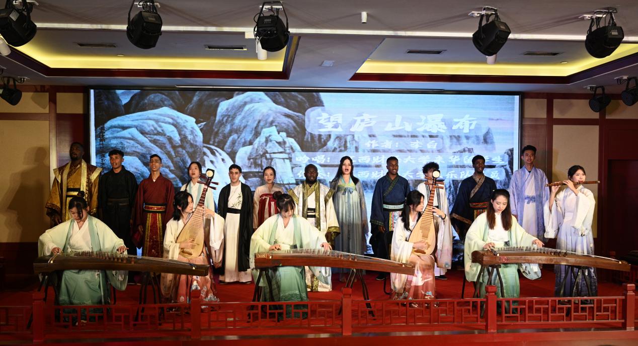 这12名热爱中国传统文化的来华留学生,已跟随我国非遗传承人宗九奇先生的弟子黄谦先生,进行了近两个月的刻苦练习,学习“楚调唐音-望庐山瀑布”诵唱。不同肤色的江财留学生们穿着中国传统服饰,他们字正腔圆的诵读和婉转的歌吟给现场观众带来了不一样的听觉体验,并成为本场活动的亮点和媒体关注的焦点,现场观众纷纷为他们的精彩表现点赞。外籍留学生的参与开创了我省楚调唐音歌吟史上的“首次”:首次有外籍人员参加现场楚调唐音的诵唱。