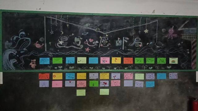 见字如面,展信舒颜。今天志愿者们将孩子们做好的信封粘贴在了班级后黑板,制作了一面“星与心愿邮局”墙,这面墙的作用是帮助志愿者与同学之间、同学与同学之间交换信件,交流心声。“第一次见你的时候就觉得你长得很漂亮,在阳光下自我介绍看起来很好相处,声音很甜,很喜欢你。”这是一位同学放在老师信封里的纸条,稚嫩的笔迹充满着真诚。透过文字似乎可以看到孩子们努力写好一笔一划的样子,他们真心地喜欢前来教学的志愿者,认真地完成每一次课程任务,用心地给志愿者们写信。“星与心愿邮局”让孩子们有了一个倾诉的机会,让那些无法表达的秘密得以诉说,让感情的传达有了载体。