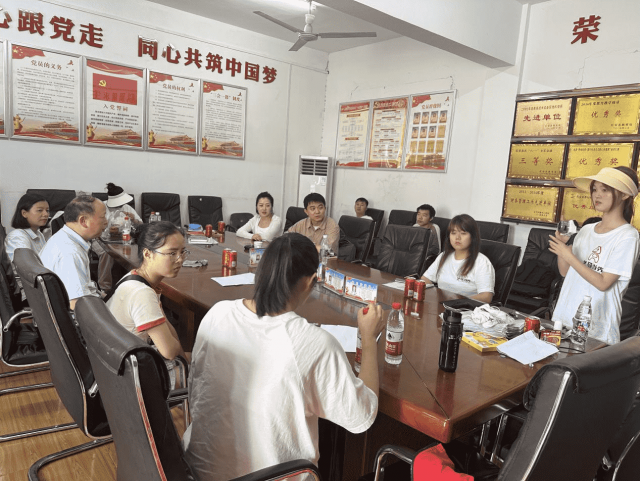 指导老师刘歆玮和胡家翀带领志愿服务团队与当地县团委书记以及太平镇小学校长开展交流座谈会。座谈中,红安县团委书记潘小燕指出:希望江西财经大学能与红安老区进行深度合作,通过共建红色实践基地,把暑期社会实践教育课堂长期设在红安,使思政小课堂同社会大课堂相结合,让青年学生感悟红色文化,赓续红色血脉,培养更多堪当民族复兴大任的时代新人。
