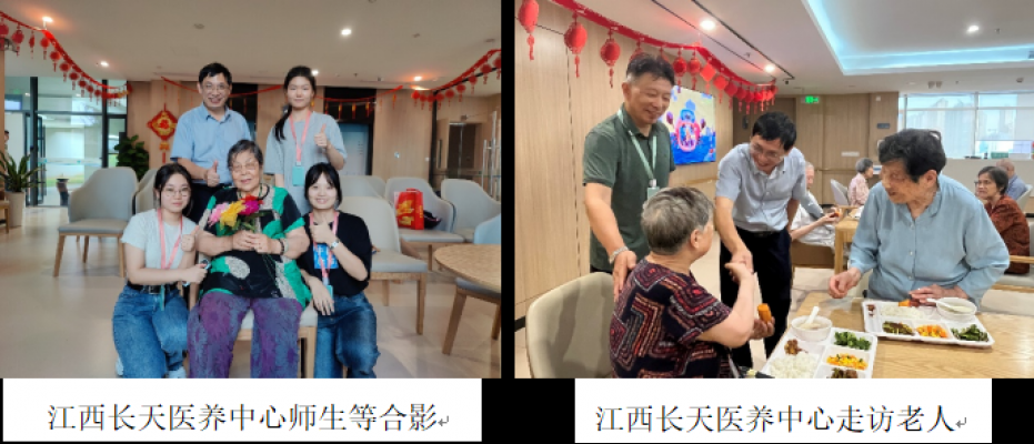 在江西长天医养中心,蒋国河在该中心社工部负责人的陪同下,看望慰问了失能智老人,鼓励实习学生将理论与实践相结合,虚心向一线社工学习与失能智老年人沟通的技能,发挥专业所长,丰富老年人的精神文化生活。