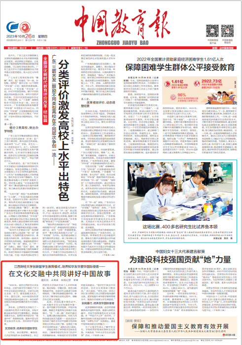 10月26日,《中国教育报》01版报道我校创新留学生教育模式,培养知华友华爱华国际使者,在文化交融中共同讲好中国故事。