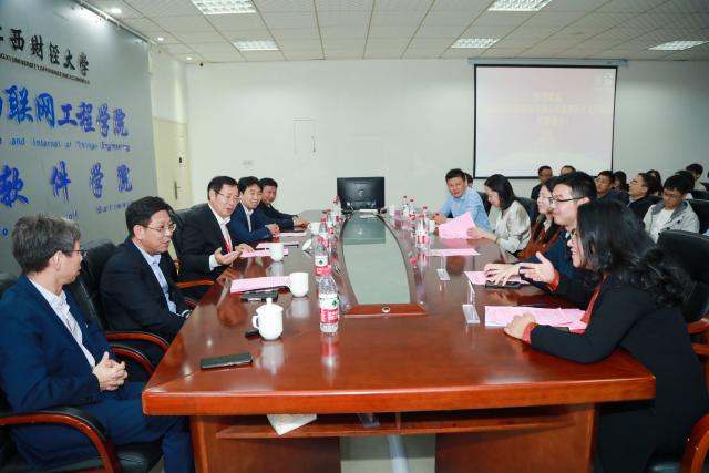 白耀辉对王文京一行的到访表示热烈欢迎,并从学院的历史沿革、师资力量、学科平台、学科建设、社会服务、国际化办学和人才培养等方面展开详细介绍。在自由交流环节,教师代表夏家莉、钟元生对用友一直以来对学校给予的大力支持,对学生求知求学、成长成才道路上给予的帮助表示由衷感谢。教师代表邓庆山通过“银靴杯”足球赛的故事分享与用友的不解之缘,并对用友平台赋能教师成长表达感激之情。