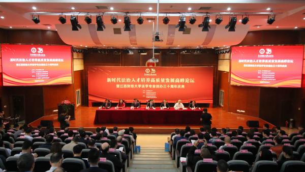 2023年10月29日,新时代法治人才培养高质量发展高峰论坛暨江西财经大学法学专业创办三十周年庆典活动在法学院模拟法庭顺利举行。江西财经大学校长邓辉,江西省省政府参事、省检察院原副检察长张国轩,浙江省银保监局原党委委员、一级巡视员汤学斌,江西省人民检察院党组成员、副检察长张勇玲,江西省高级人民法院审判委员会专职委员陈建平,江西省高级人民法院二级高级法官段亦枫,华东交通大学副校长杨德敏,华东交通大学纪委书记曹国定,九江职业大学校长汤泾洪等出席,省内外兄弟高校代表、校友代表以及在校师生代表等共计400余人参加大会。庆典活动由江西财经大学法学院党委书记郭海峰主持。