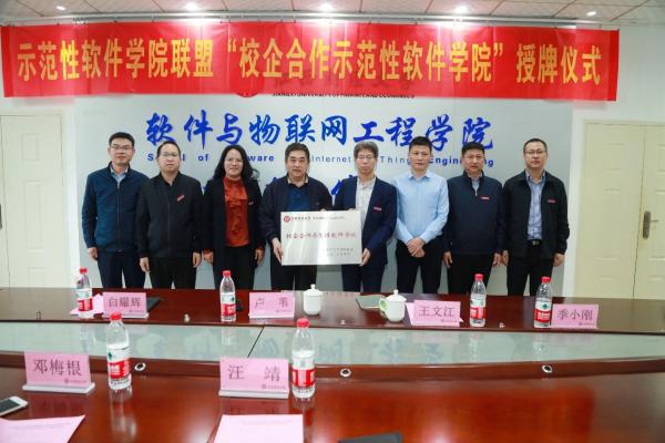 10月27日下午,软件与物联网工程学院举行“校企合作示范性软件学院”授牌仪式,教育部高等学校软件工程专业教学指导委员会副主任委员、示范性软件学院联盟理事长卢苇教授出席。会前,校长邓辉、副校长阙善栋会见了卢苇教授。校领导对软件与物联网工程学院获批“校企合作示范性软件学院”给与肯定,希望学院继续在学校数字财经大学建设中,积极推进“新文科”“新工科”转型,推进产教融合发展,助力学校高质量发展。