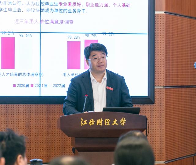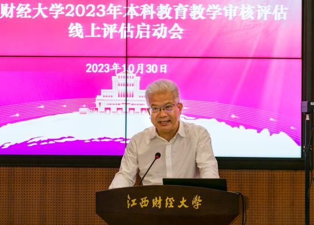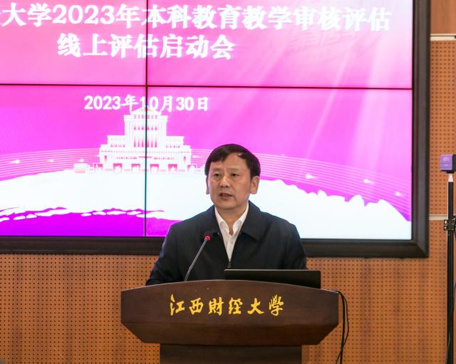 卢福财致辞,他代表学校党委、行政和全体师生员工,向参与此次审核评估,为我校本科教育事业发展把脉问诊的各位专家和各位省厅领导表示衷心的感谢。他表示,学校在100年的办学历程中,始终坚持以本为本,把本科教育放在人才培养的核心地位,教育教学的基础地位,新时代教育发展的前沿地位。学校秉承“信敏廉毅”的校训和“敬业乐群、臻于至善”的大学精神,形成了培养具有“信敏廉毅”素质的创新创业型人才的办学特色。学校正在大力推进高水平学术研究型大学、全国一流数字财经大学、服务江西地方经济社会发展标杆大学“三个转型”任务建设。新一轮本科教育教学审核评估,是学校在新时代新征程中接受的又一次评估。这次审核评估是对学校全体师生员工统一思想,加强本科教育教学工作,全面总结立德树人成效,全面检查质量保障能力和全面展示人才培养水平的一次重大考验;是学校深化教育教学综合改革,推进双一流建设,创新人才培养体制机制,发挥以评定向和以评促强作用的一次重要机遇。卢福财表示,学校将全力支持专家组的工作,虚心接受专家们的把脉问诊,认真按照专家们提出的意见建议对症下药,坚决抓好反馈问题的整改落实,久久为功,补短板强弱项,高质量推进本科教育教学工作,为党育人,为国育才。