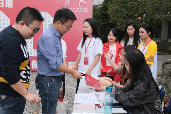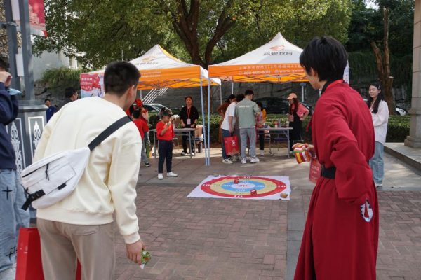在十二生肖广场上,正在开展的校史答题和丢沙包小游戏,既是一次童趣时光的复现,也是一场对校园旧史的追忆。丢沙包环节中,校友们屏息凝神、全力以赴,多次掷中靶心,顺利拿下印章。此外,校史答题比赛里,校友们积极踊跃、争先恐后,充分展现出江财人深厚的知识储备,以及对江财百年峥嵘岁月的感知、感受与感悟。