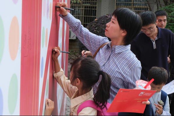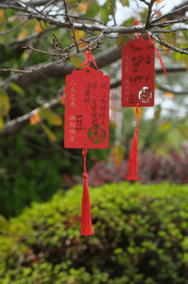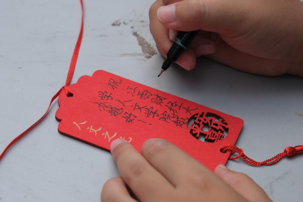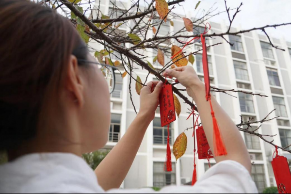 结束各个站点的打卡后,校友们再度相聚在英庐前,为纪念册盖上了最后一章,同时也收获了丰富精美的礼品。随后,他们在印有“前程似锦”“平安喜乐”的许愿牌上写下了自己的心愿以及对母校的祝福,将之挂在树梢。红色许愿牌在微风中飘扬,沉甸甸的枝头承载着大家心中的美好,期待着下一次校友们的归来。