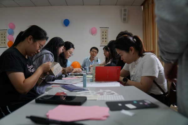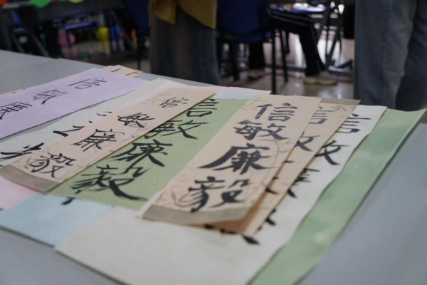 一张张课桌装下的是谁的青春,第二站活动主题为“时光轮转,情归纸笔”,回到那些年一起待过的教室,以纸笔写下“思念”二字。在英庐二教210教室,我们设置了“俯拾皆诗意”——拼贴诗以及“翰墨扬正气”——毛笔写校训两个小游戏。校友们把诗意拼贴换化成对江财的祝福,再一笔一划写下江财的校训,那些母校教会我们的,已经融入每一个江财人的血液里。