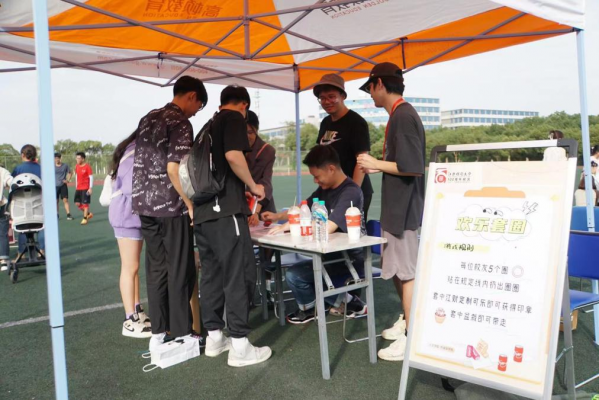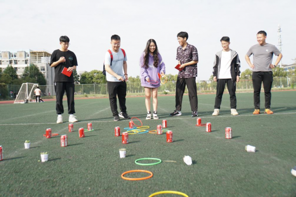 西区操场上,一场别开生面的趣味投壶和欢乐套圈活动正在进行时,印有“江财百年”的定制款可乐和盆栽静待收入囊中。随着套圈的落地,校友们或欢呼雀跃,或扼腕叹息。大家相互传授技巧、加油打气,场面笑语欢声、其乐融融。所谓套圈,是“套”住幸福,亦是“圈”住快乐。