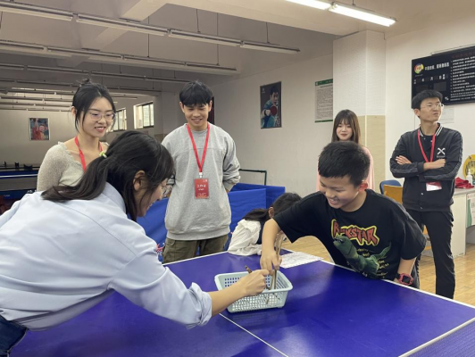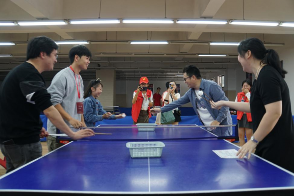 在麦庐体育馆一楼乒乓球馆里,上演了一场场反应与耐力的比拼。校友们听令摆动作,搞怪的姿势博得满场欢笑,在出其不意之时吹起“号角”,筷子化作“武器”,在一来一回间,看谁能夺得那小小白球。许多校友携带挚爱亲友共同参与到游戏当中,笑声在每个人之间流动。