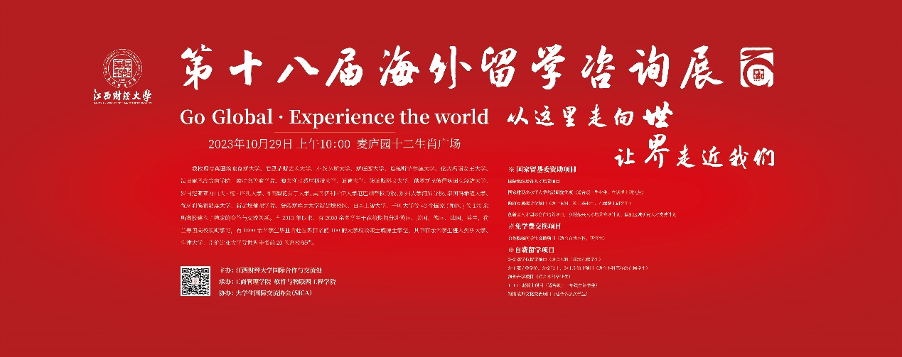 10月29日上午,伴着百年校庆的喜悦,江西财经大学第十八届海外留学咨询展在麦庐校区十二生肖广场完美落幕。本次留学展共设立了28个展位,以“Go Global, Experience the World”“从这里走向世界,让世界走进我们”为主题,为江财学子搭建了与世界沟通交流的桥梁。