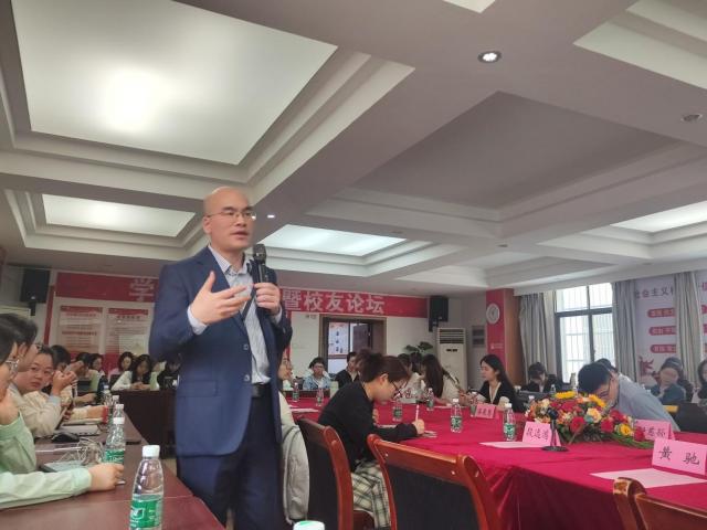 会议伊始,段远鸿对黄驰校友表示了最诚挚的欢迎和感谢,并向在场的师生介绍了黄驰校友的背景和成就。在学院师生的见证下,段远鸿主持聘任仪式,正式聘任黄驰为学院的“客座教授”与“硕士研究生校外实践导师”,张仲芳颁发聘书。黄驰校友在聘任仪式上表示感激,他郑重承诺,将全力以赴发挥自己的专业优势和经验,为学院的发展和教育事业做出更大的贡献。